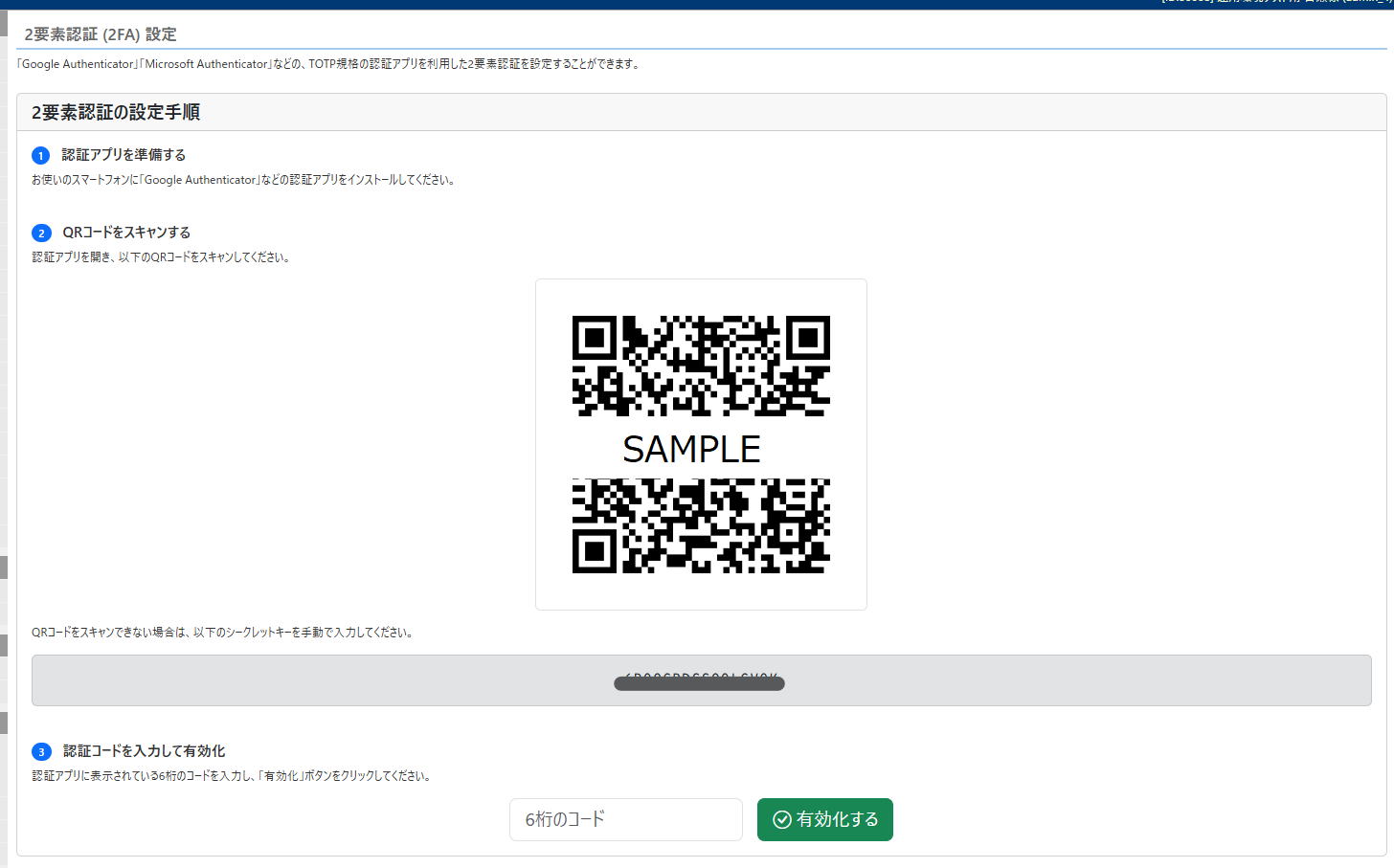 発行されたパスワードを同一画面上の「3.認証コードを入力して有効化」という欄に入力することで設定が完了します。